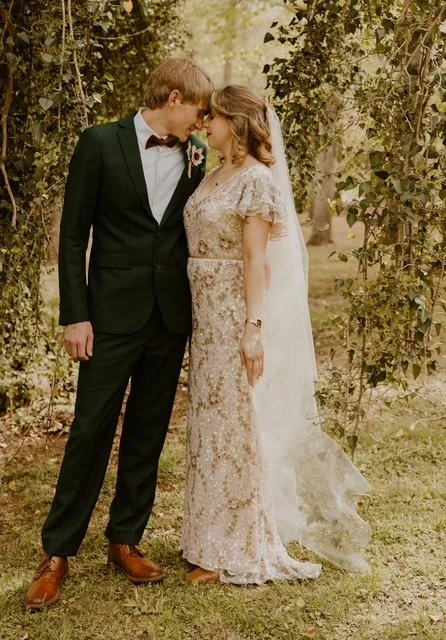 A bride and groom standing close together in a wooded outdoor setting during their wedding, with the bride holding a bouquet of flowers and both smiling.