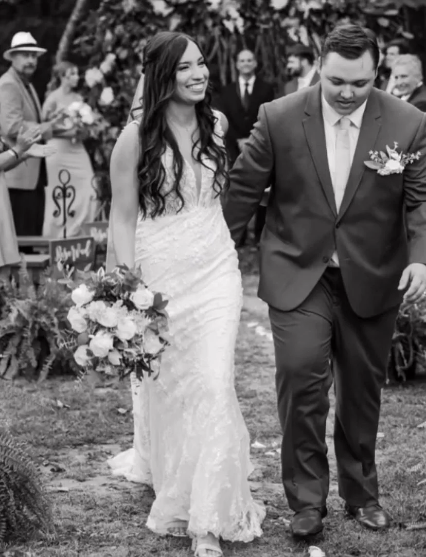 A bride and groom walking down an outdoor aisle at their wedding, surrounded by guests and greenery, with the bride holding a bouquet and smiling.