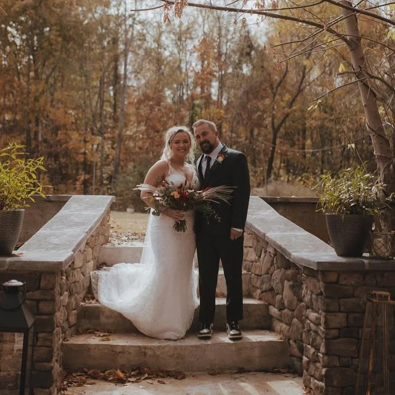 A bride and groom standing together outdoors on stone steps, surrounded by autumn trees, with the bride holding a bouquet and both smiling.