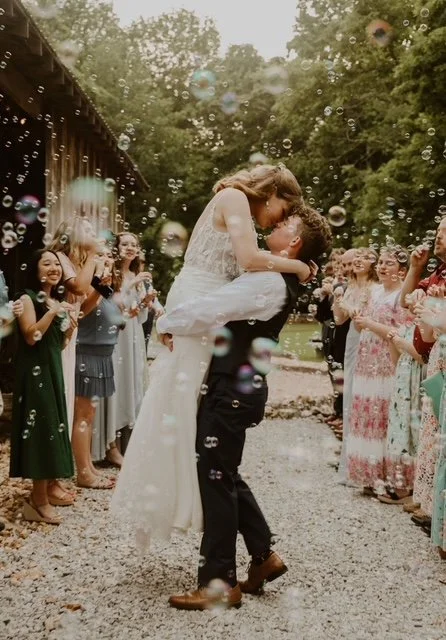 A newlywed couple kissing outdoors surrounded by friends in a celebration with bubbles.