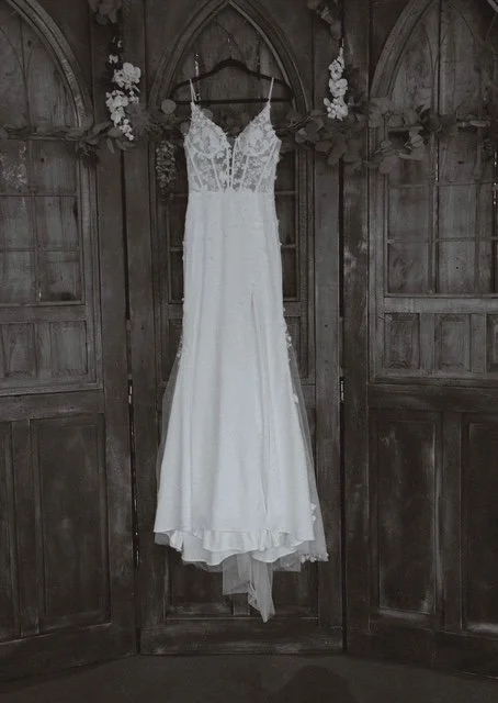 White wedding dress hanging on a wooden background with floral decorations.